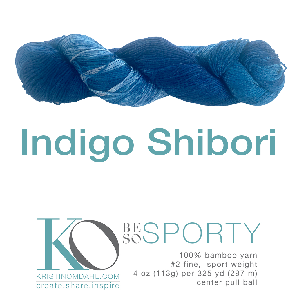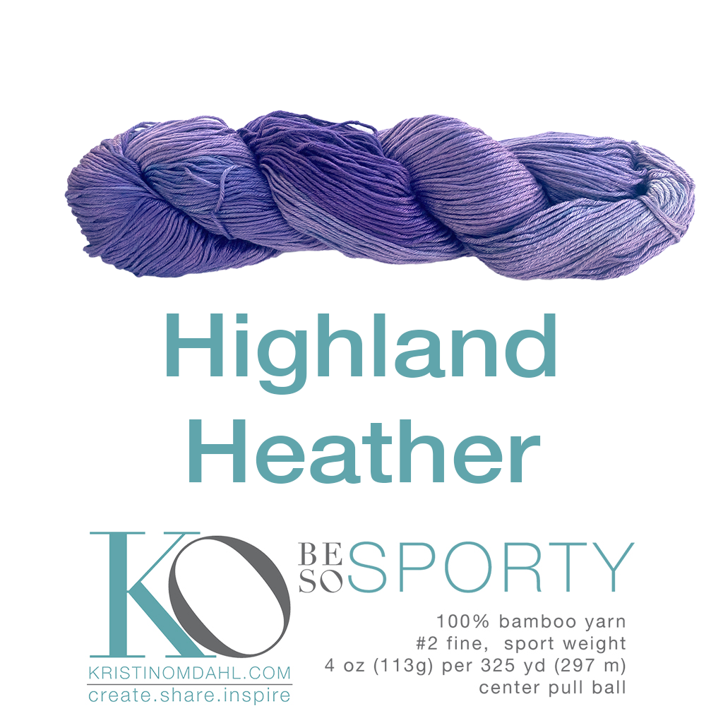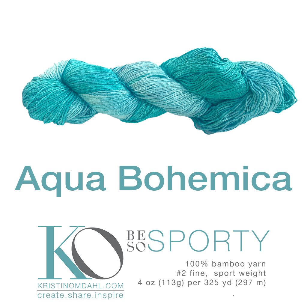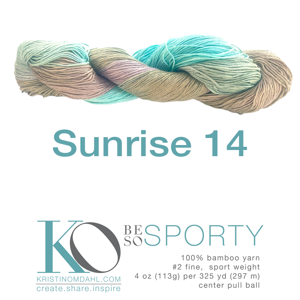 #5 Be So Sporty Yarn; #2 sport weight, 100% bamboo yarn; 325 yds (297m) per 4 oz (113g); comes in varying colors as this is hand dyed yarn; The top five most popular colors of Be So Sporty yarn 2021: sandcastle, highland heather, indigo shibori, sunrise 14 and flowering aqua bohemica. Browse all colors of Be So Sporty Yarn HERE