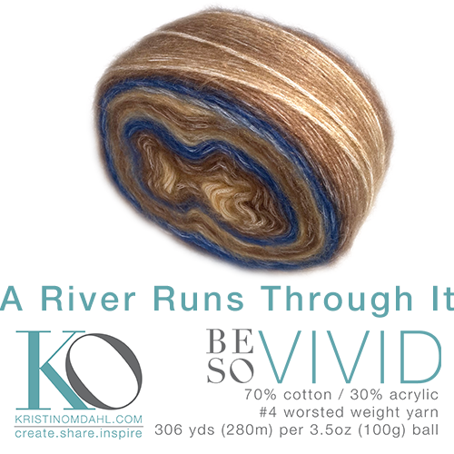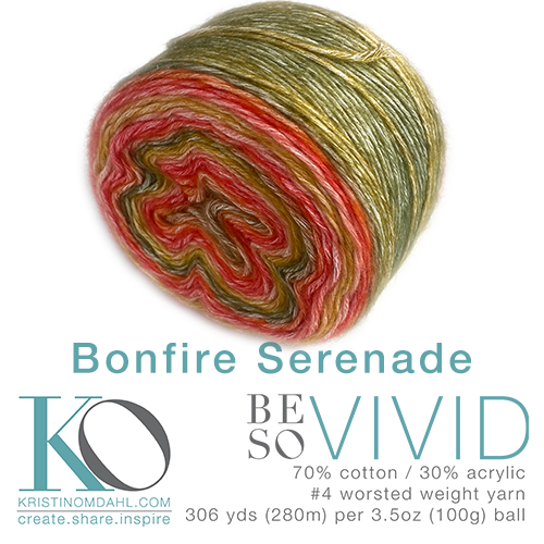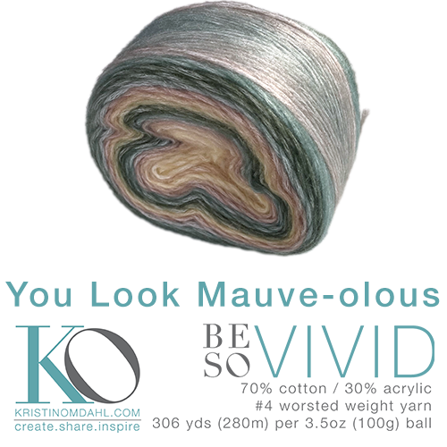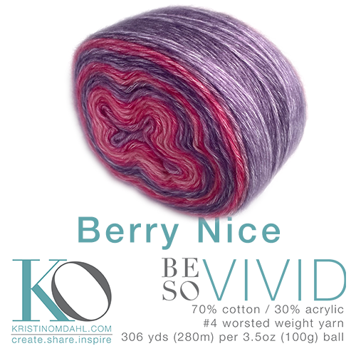 #4 Be So Vivid Yarn; #4 worsted weight, self striping 70% cotton / 30% acrylic yarn; 306 yds (280m) per 3.5oz (100g); comes in 15 colors; top five most popular colors of Be So Vivid Yarn 2021: berry nice, you me & the sea, a river runs through it, you look mauve-e-lous, and bonfire serenade. Browse all 15 colors HERE