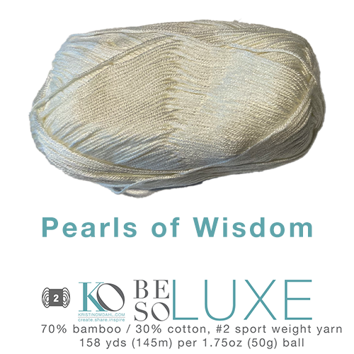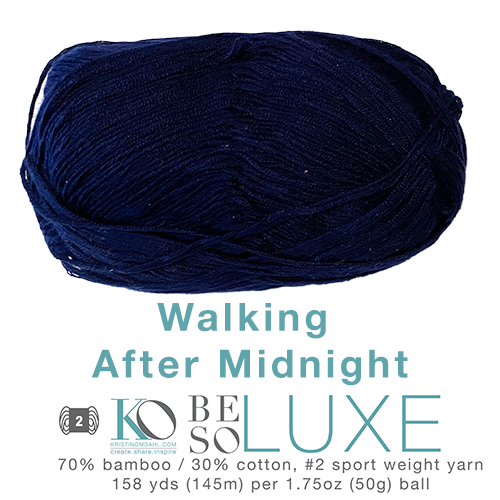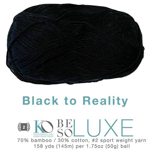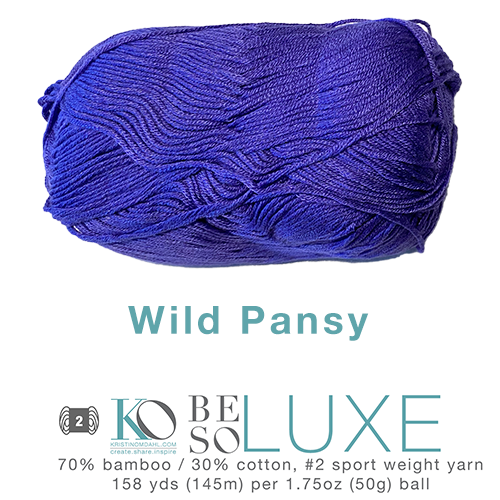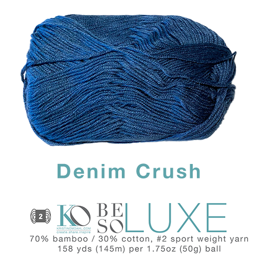 #3 Be So Luxe Yarn; #2 sport weight 70% bamboo / 30% cotton yarn; 158 yds (145m) per 1.75 oz (50g); comes in 48 colors; top five most popular colors of Be So Luxe Yarn 2021: denim crush, pearls of wisdom, walking after midnight, wild pansy and black to reality. Browse all 48 colors HERE