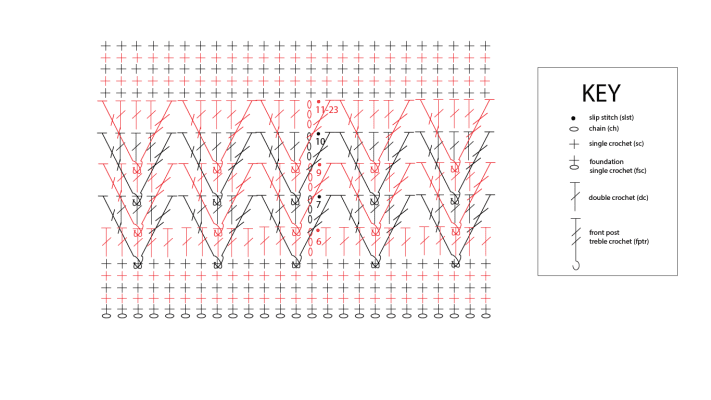 Chain (ch), double crochet (dc), single crochet (sc), foundation single crochet (fsc), and front post treble crochet (fptr).