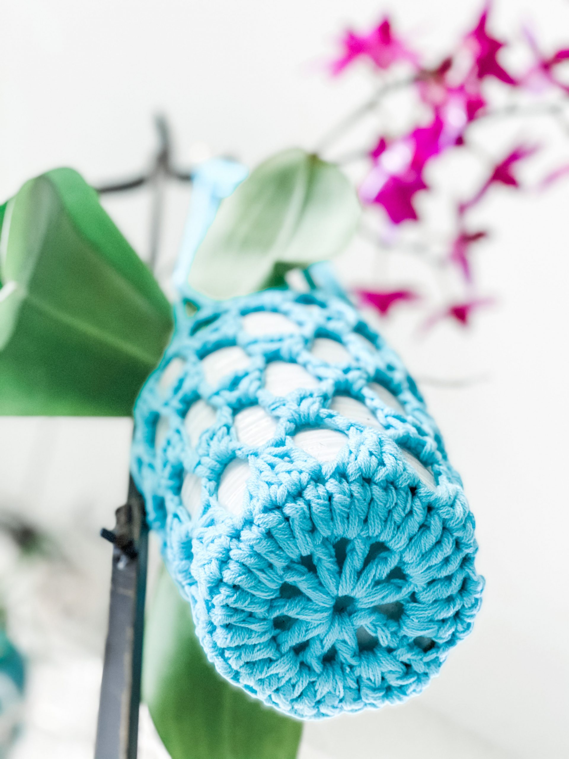The original Jocasta Crochet Plant Hanger pattern features Be So Easy Yarn in color Cyan. This yarn is well suited for indoor use and whips up super quick in #5 bulky weight yarn. I used Be So Airy Yarn for the outdoor plant hangers because this yarn is well suited for the harsher conditions of being outdoors.