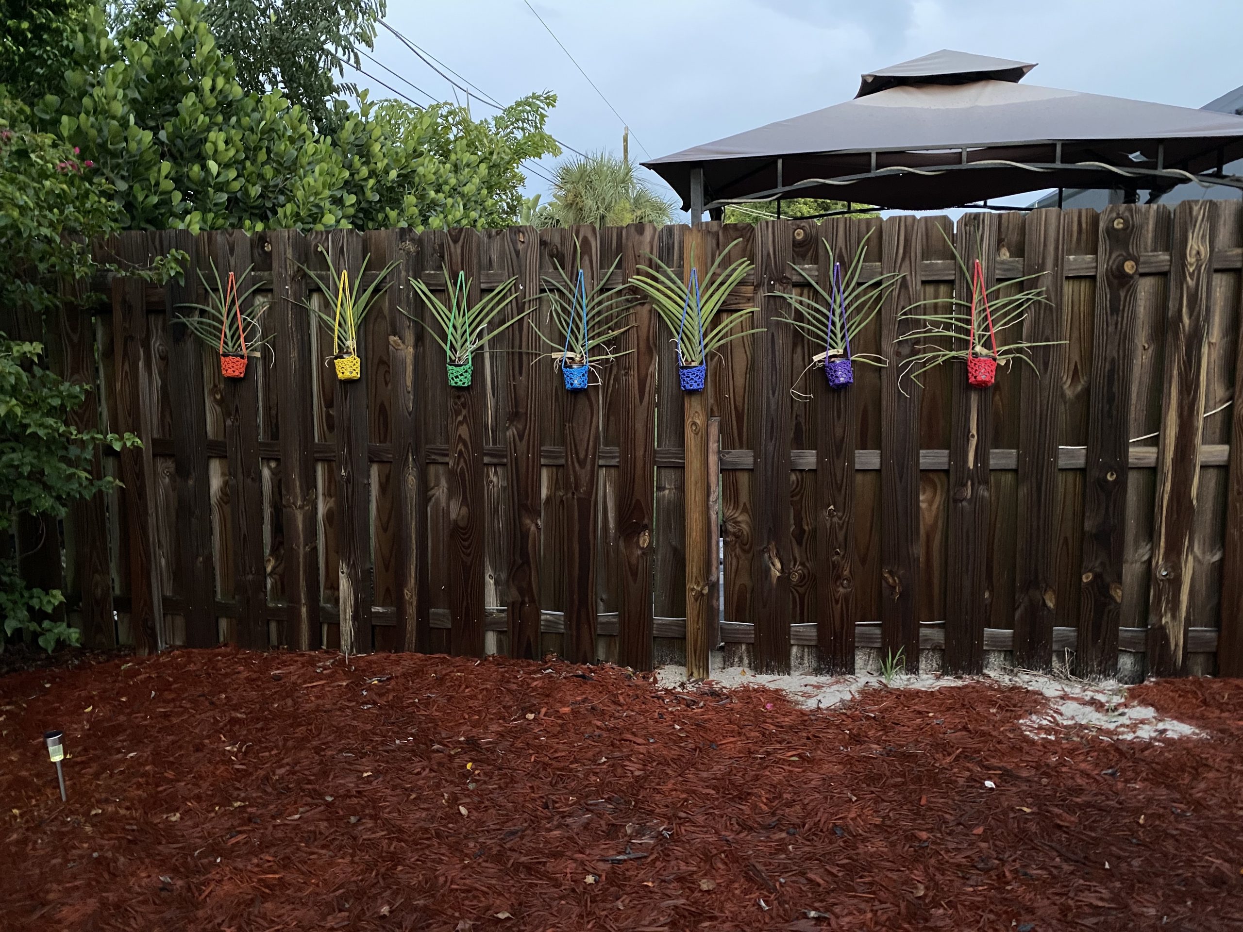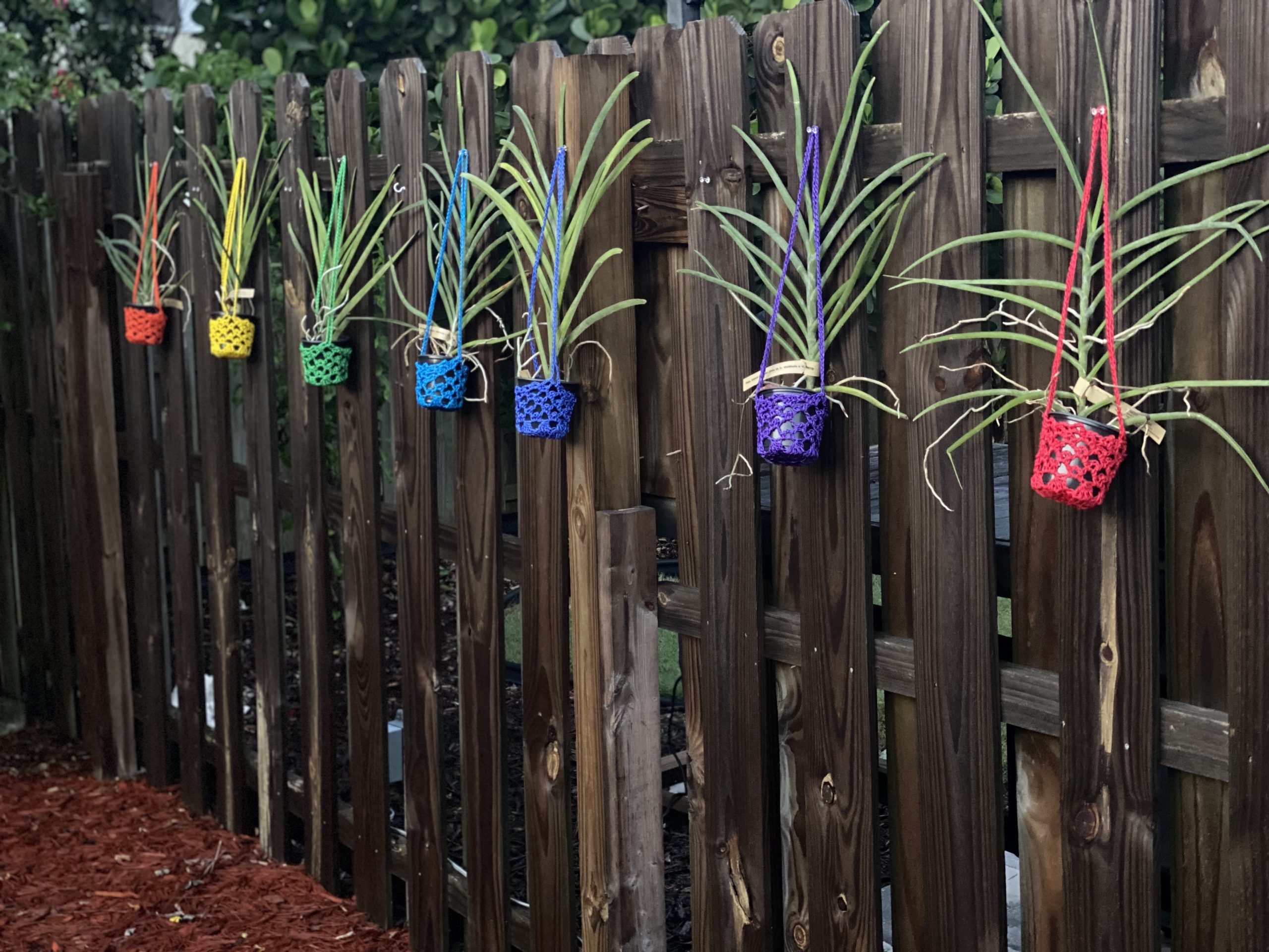 SO Exciting when I can combine my love of plants with my love of yarn! This is the Jocasta crochet plant hanger pattern in Be So Airy Yarn with H/8 (5mm) hook in the new rainbow colors: candy apple red, orange, yellow, emerald green, azure blue, sapphire blue and violet. These hangers are holding the newest additions to my orchid family: several colors and varieties of special sun-loving vanda orchids. They will flower in assorted colors and some will be fragrant, too! I’ve been nursing these babies on the lanai for a few weeks to help them transition from transplant to pot and now to full sun where they belong. Aren’t they beautiful? And whether they are flowering or not, they will always be celebrated in color with these adorable handmade crochet plant hangers.