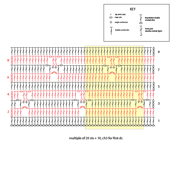 Rows 10 – 45: Rep rows 2 – 9 four more times, then rows 2 – 5 once more.