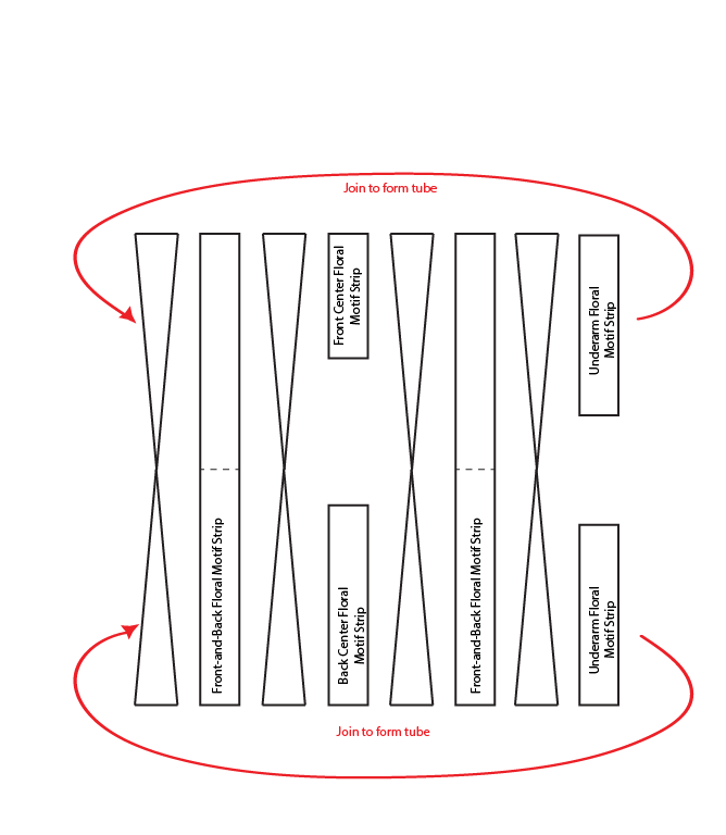 1. Join floral motif strips to center front strip.