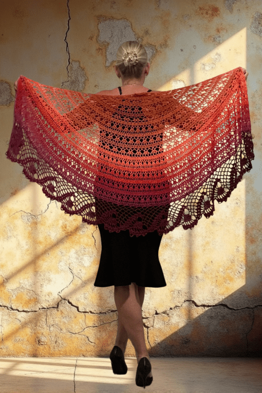 The Ember Rise Crochet Shawl is worked from the top down, beginning with a gentle pi-style shaping that creates its sweeping semicircular form. Once the body is complete, an intricate edging is joined perpendicularly as you go, forming a seamless transition of lace and texture that frames the shawl beautifully.