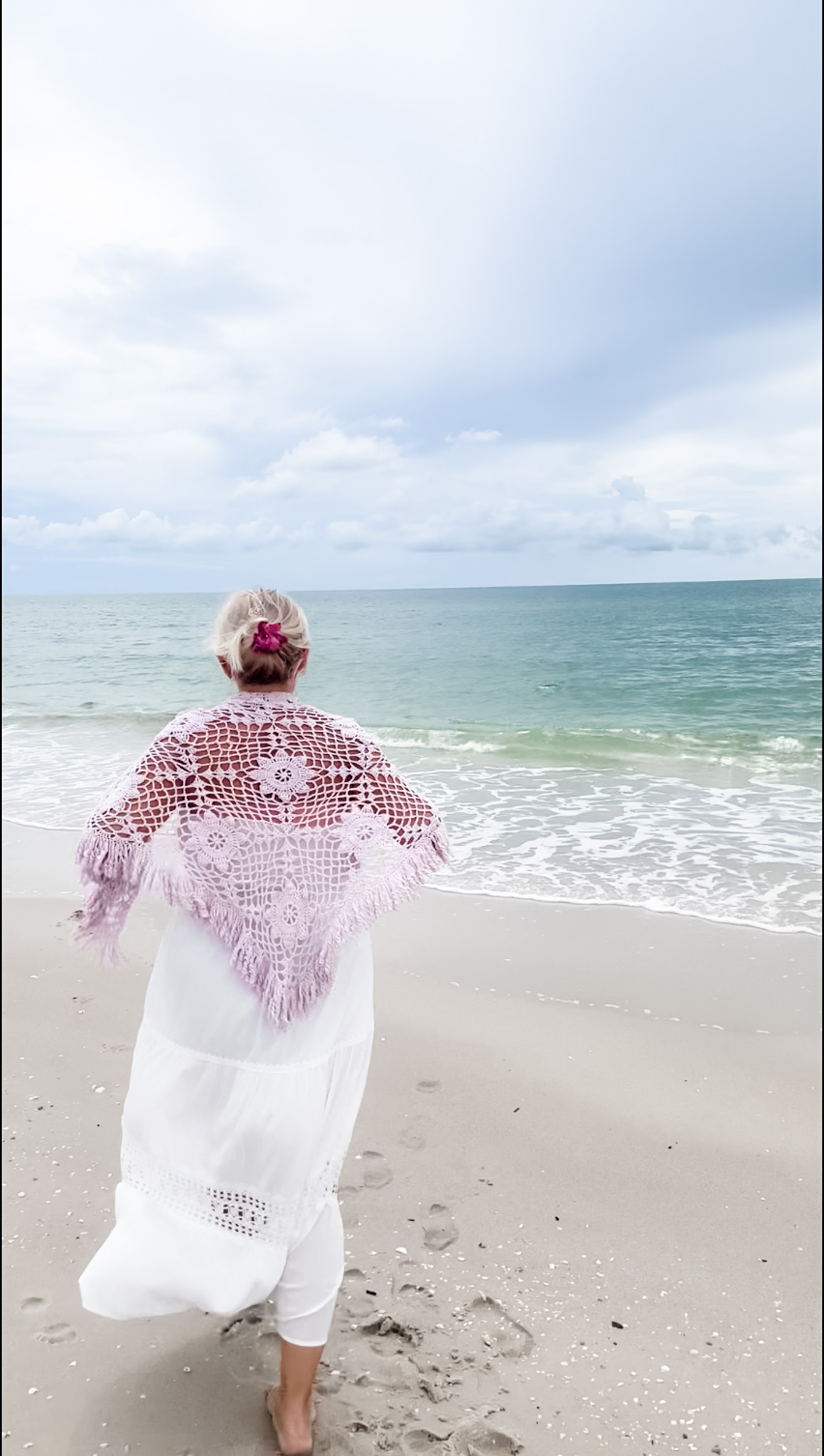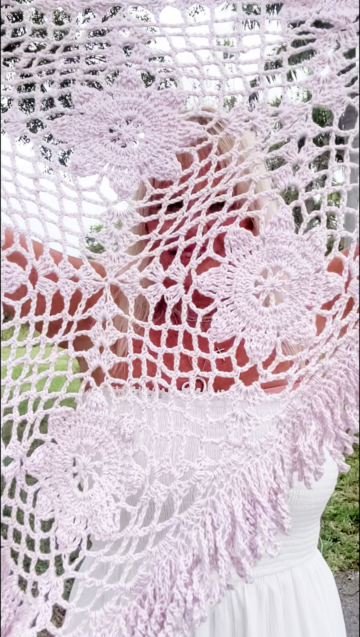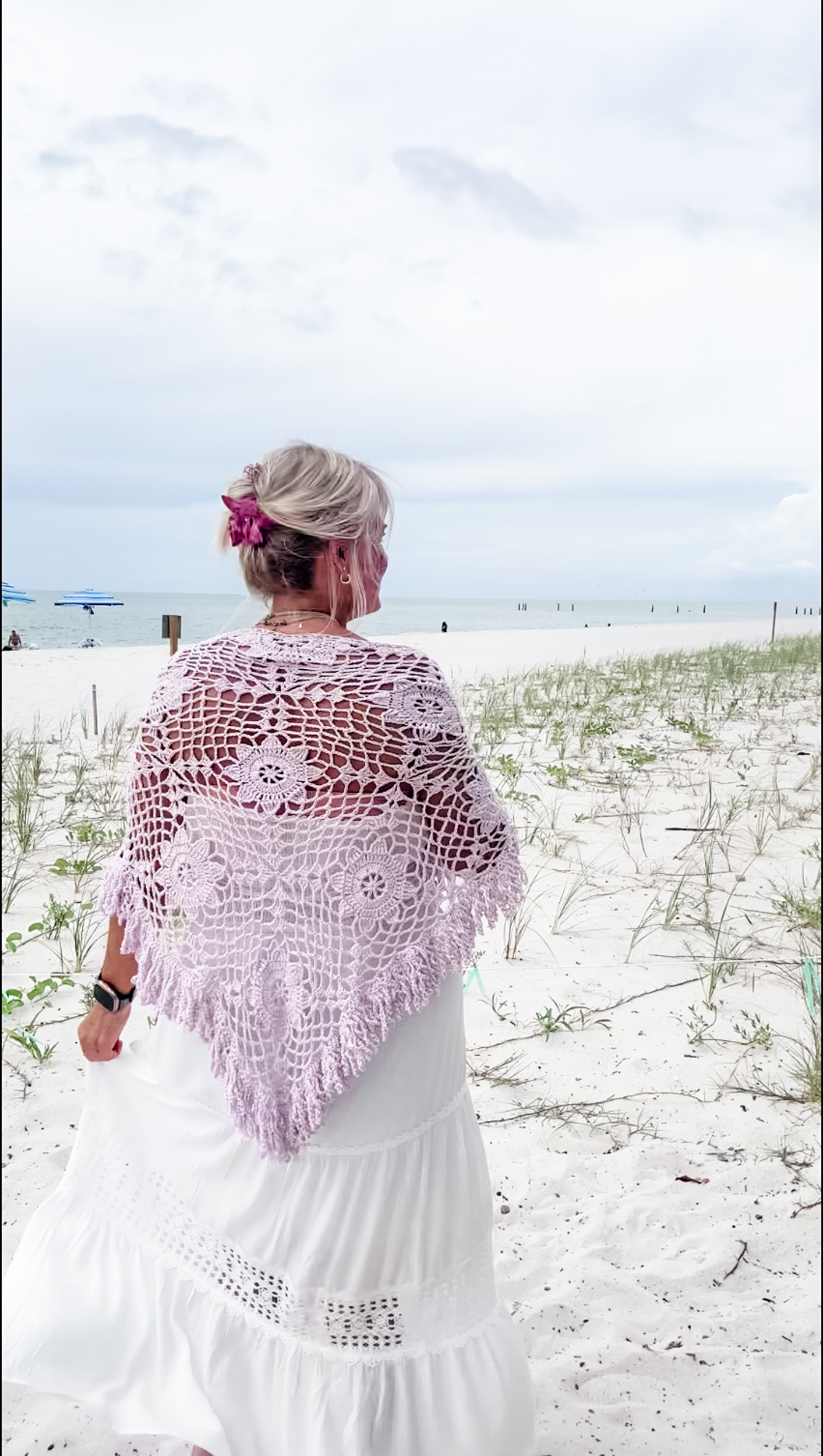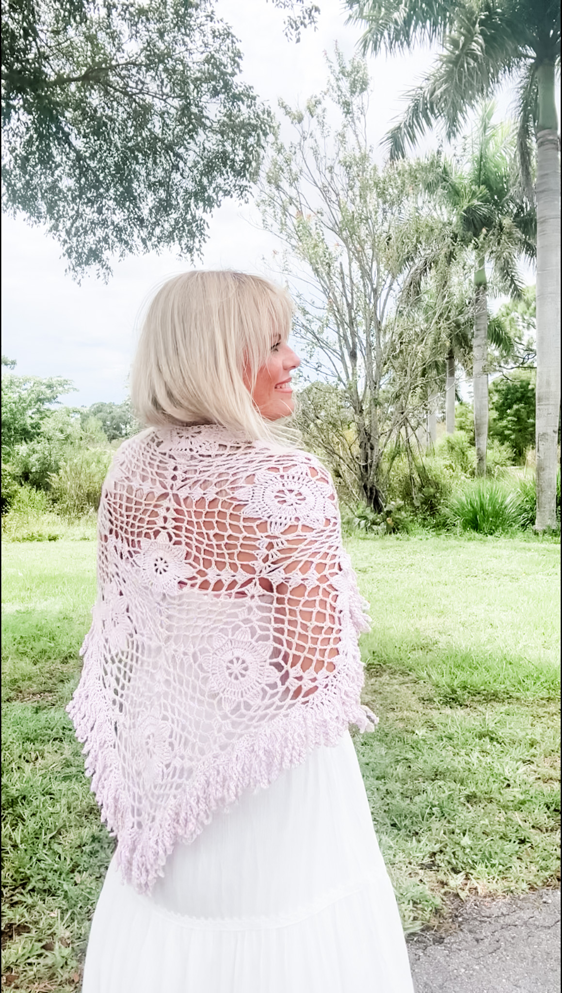 Like a gentle tide brushing the shore, the Tidal Whisper Shawl captures the rhythm and serenity of the sea through its delicate lace motifs and airy drape. Built from soft cotton squares and triangles that resemble rippling petals, each motif joins seamlessly to form a flowing triangular silhouette.
