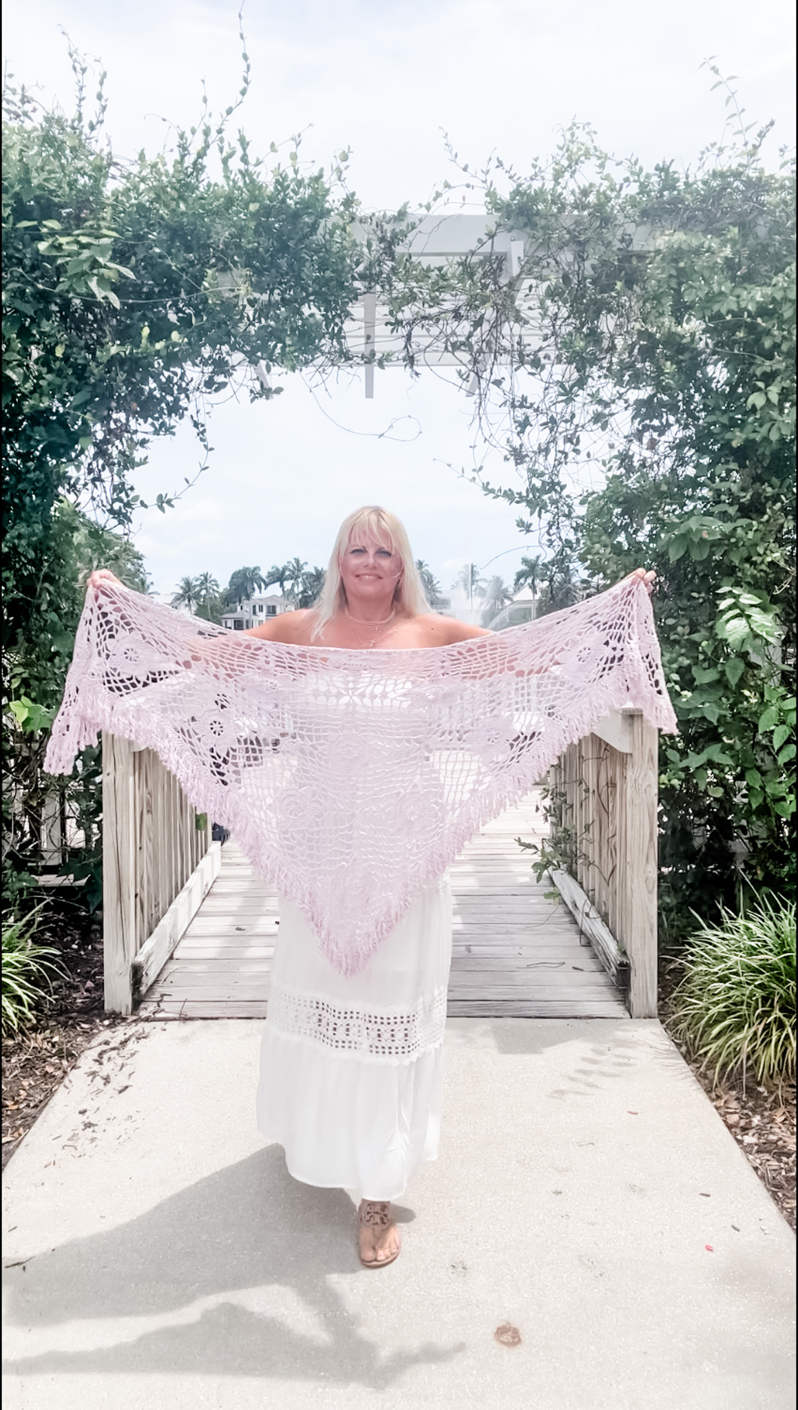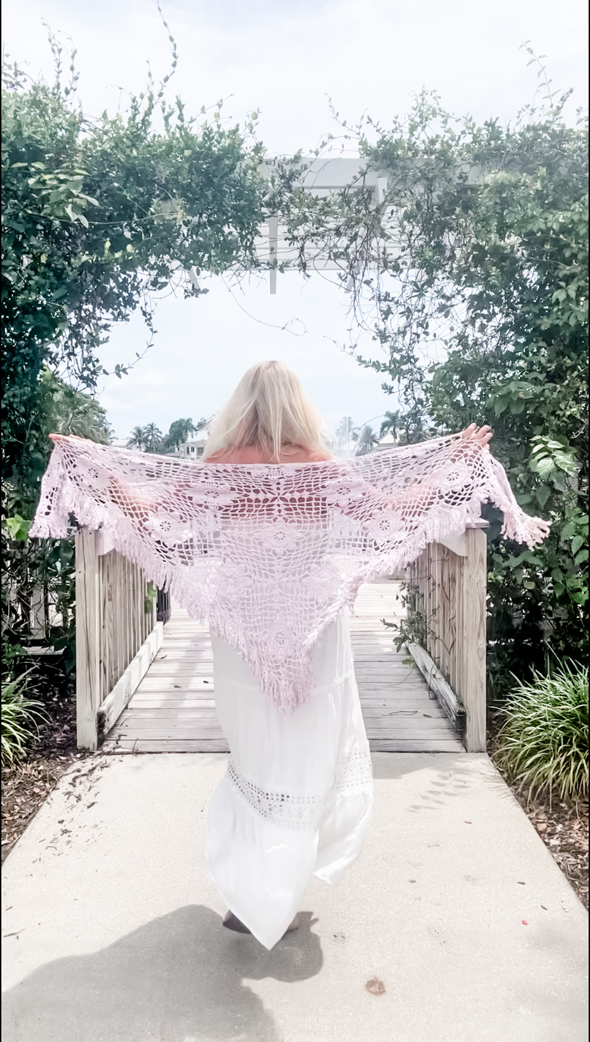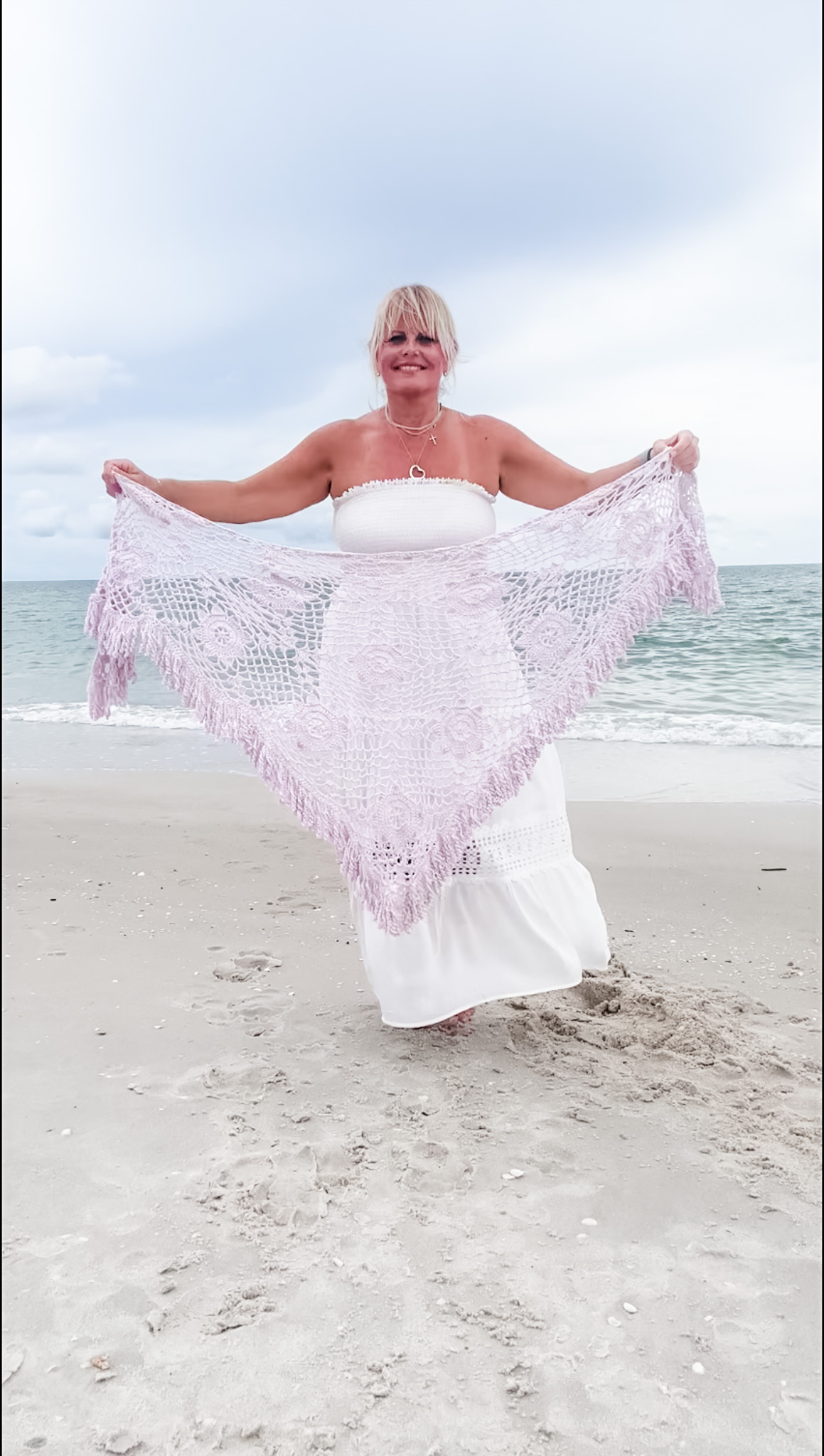 Like a gentle tide brushing the shore, the Tidal Whisper Shawl captures the rhythm and serenity of the sea through its delicate lace motifs and airy drape. Built from soft cotton squares and triangles that resemble rippling petals, each motif joins seamlessly to form a flowing triangular silhouette.