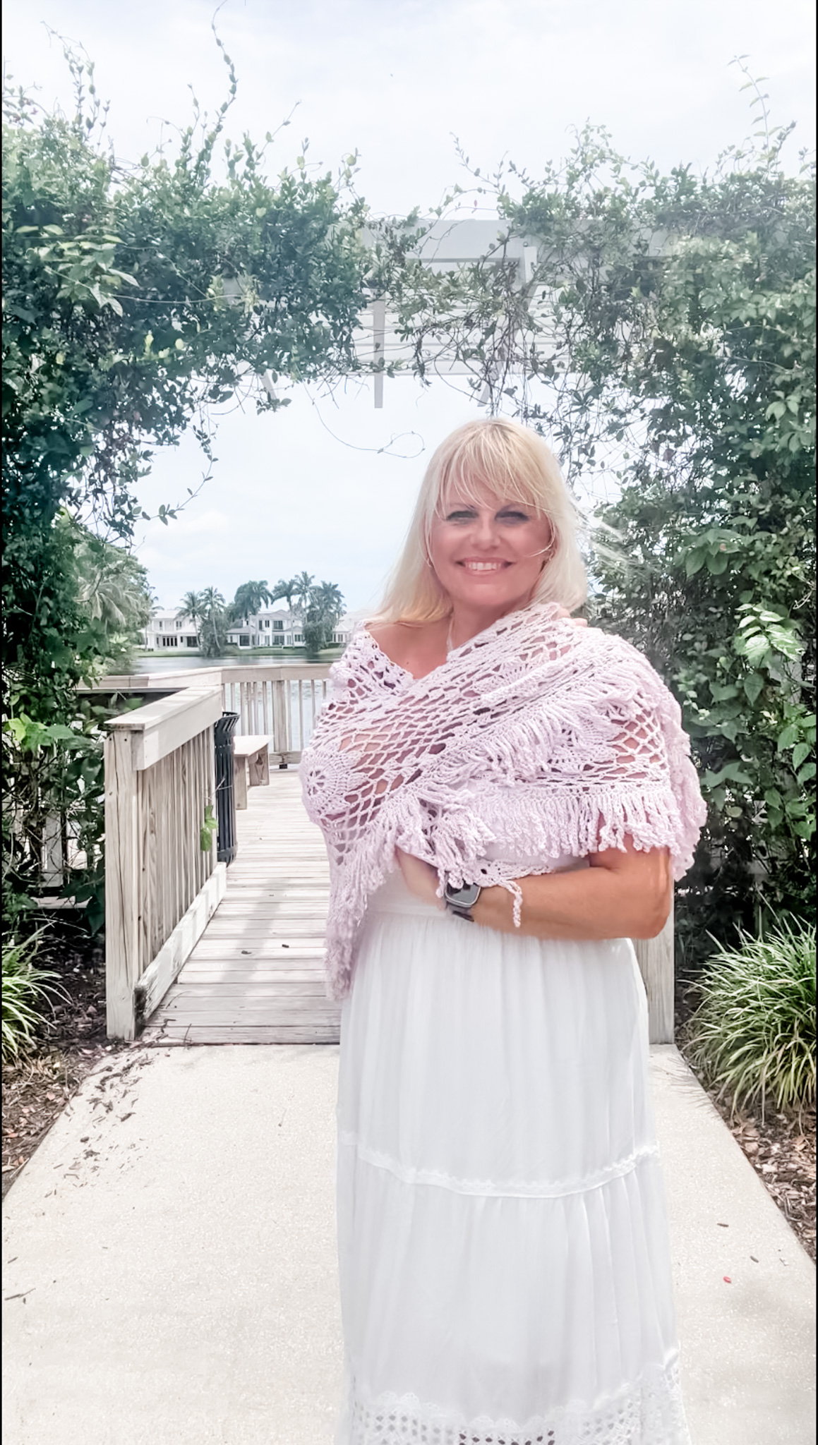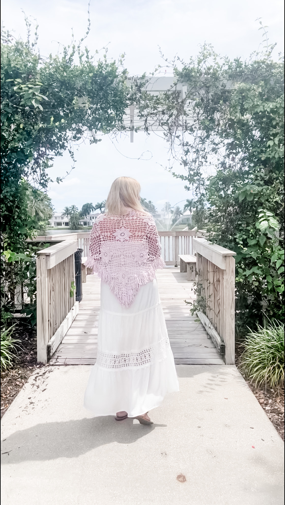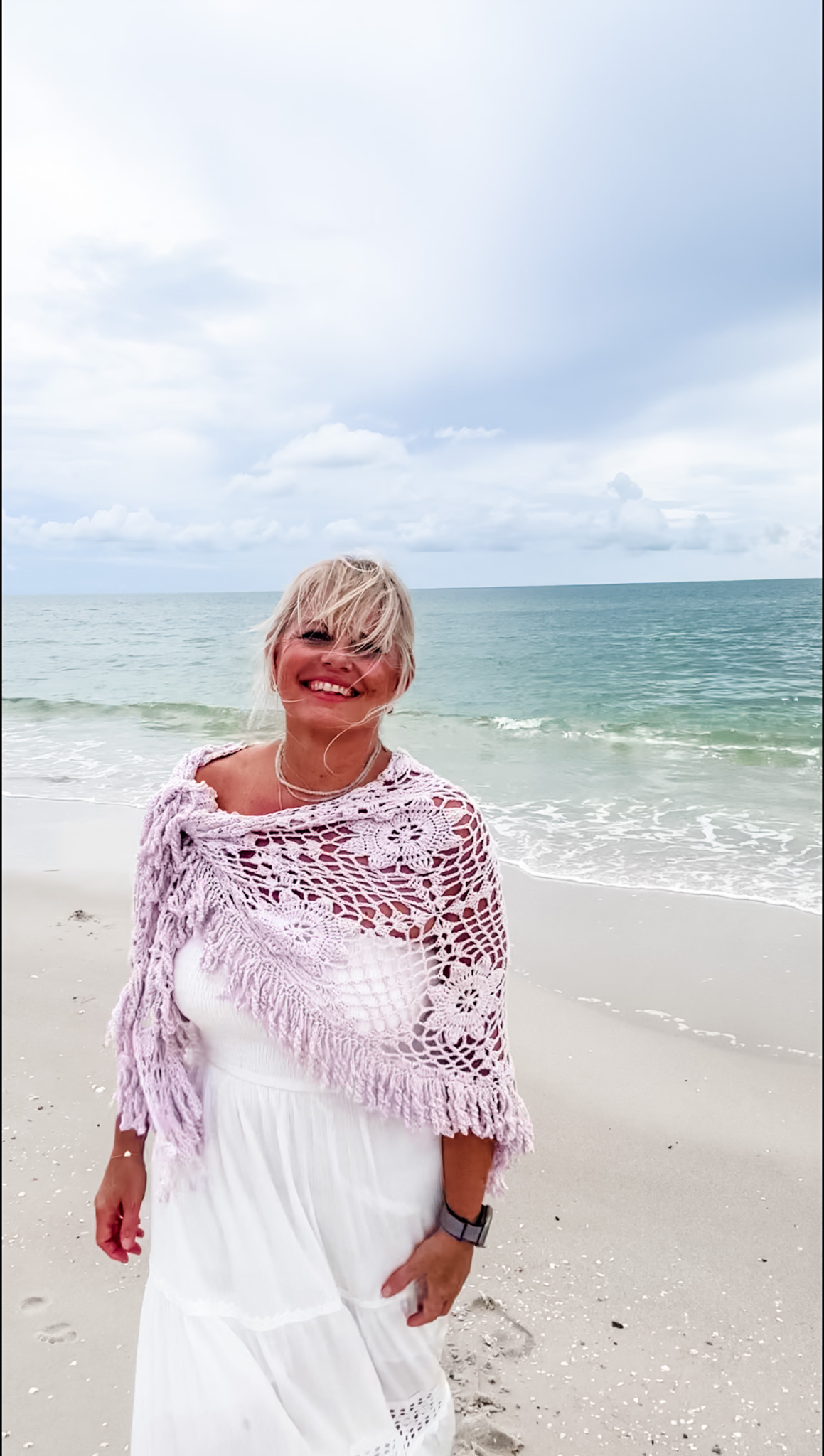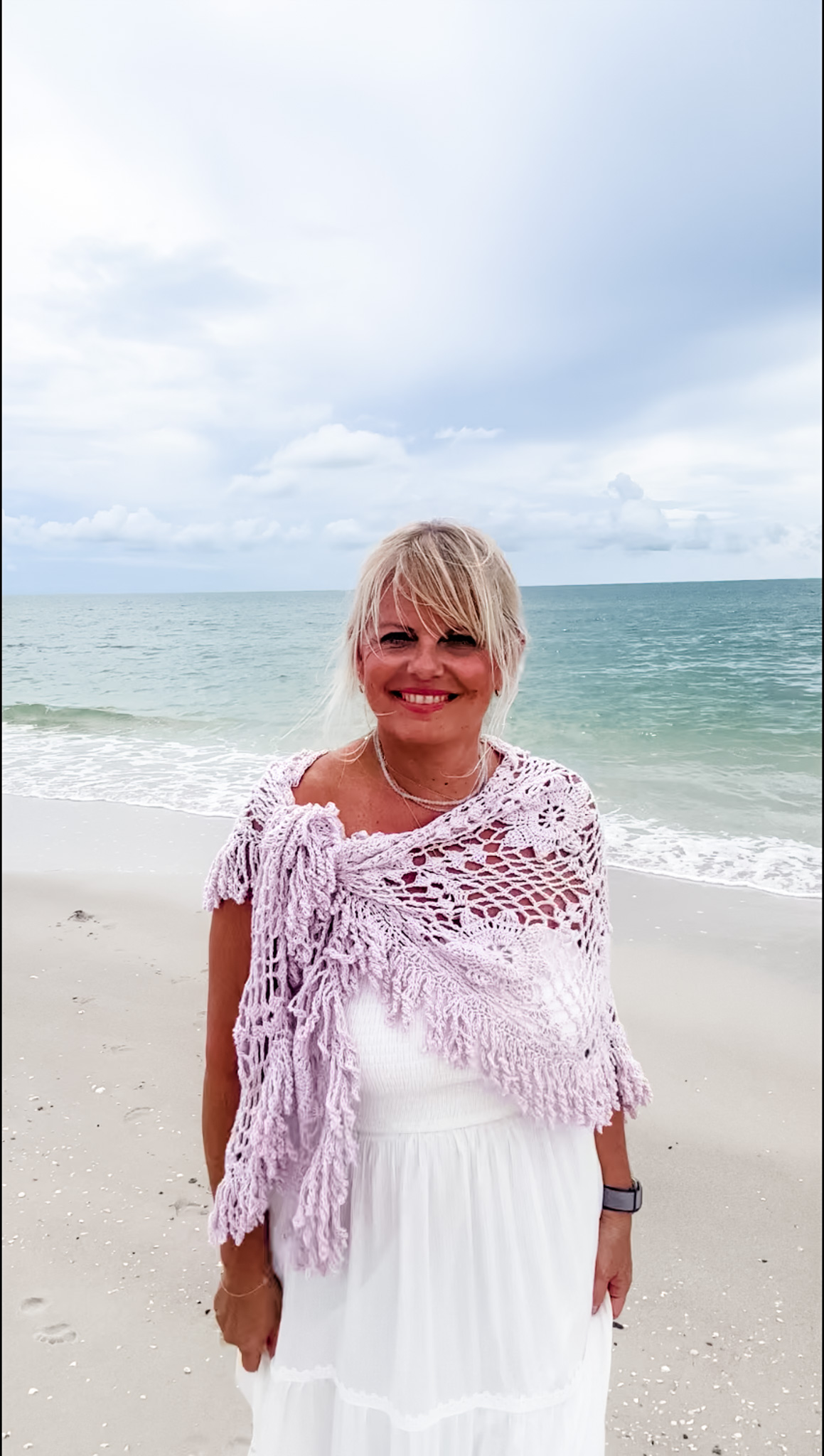Like a gentle tide brushing the shore, the Tidal Whisper Shawl captures the rhythm and serenity of the sea through its delicate lace motifs and airy drape. Built from soft cotton squares and triangles that resemble rippling petals, each motif joins seamlessly to form a flowing triangular silhouette.