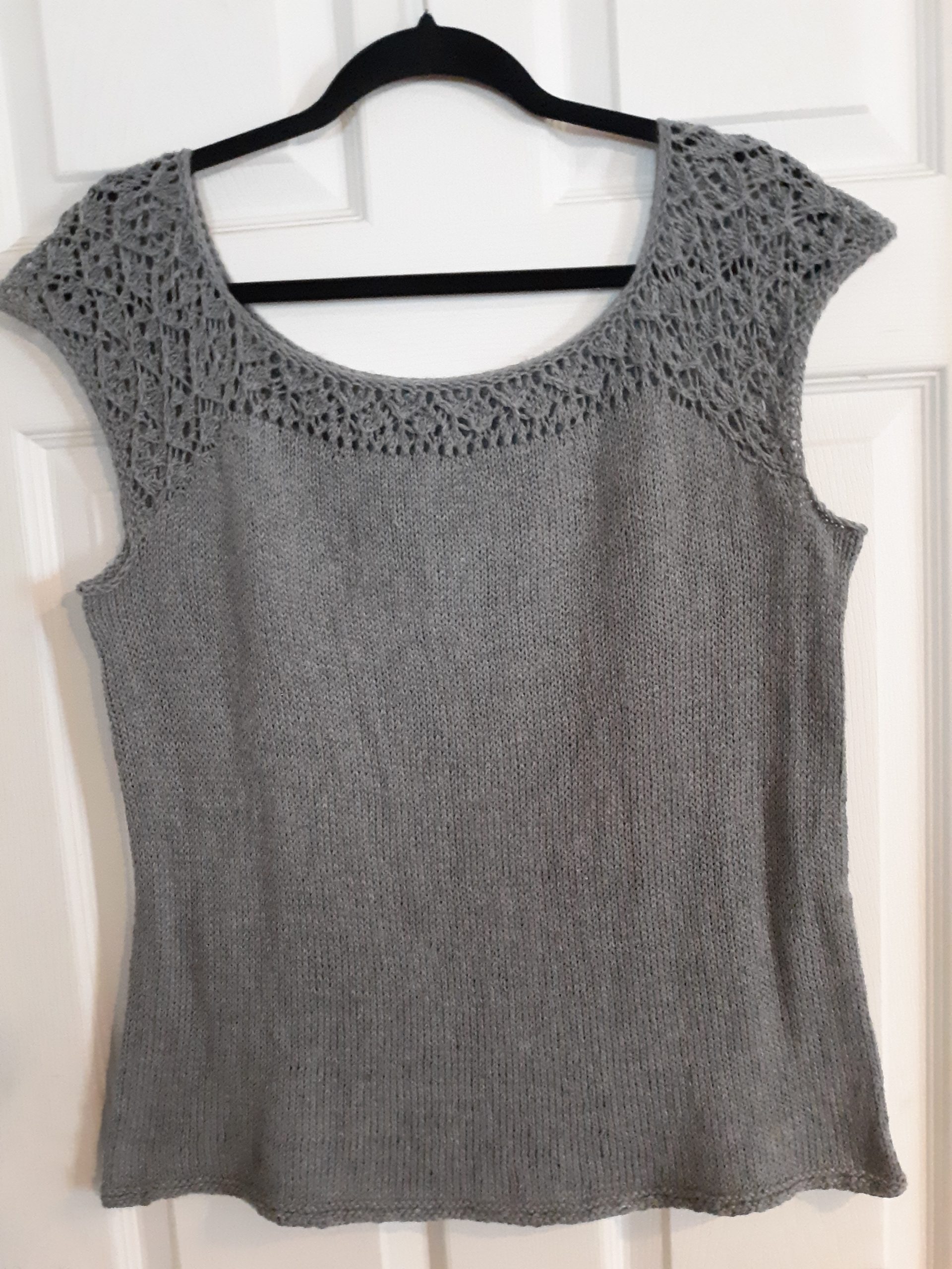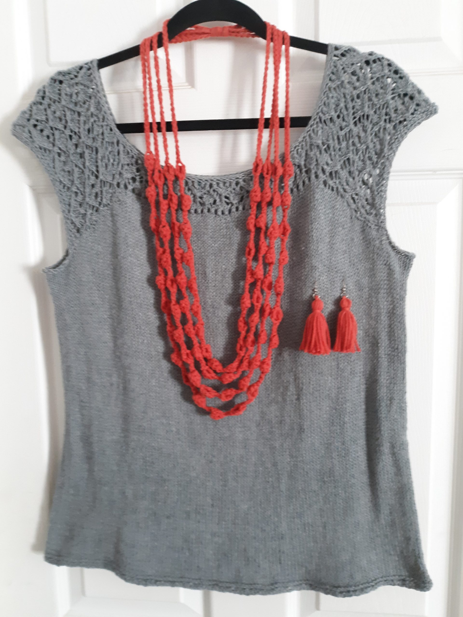 This lace yoked sweater was completed in 2019. Enjoyed learning the stitch. Also the Crocheted Bobble necklace and Tassle earring were maded with yarn from my stash.