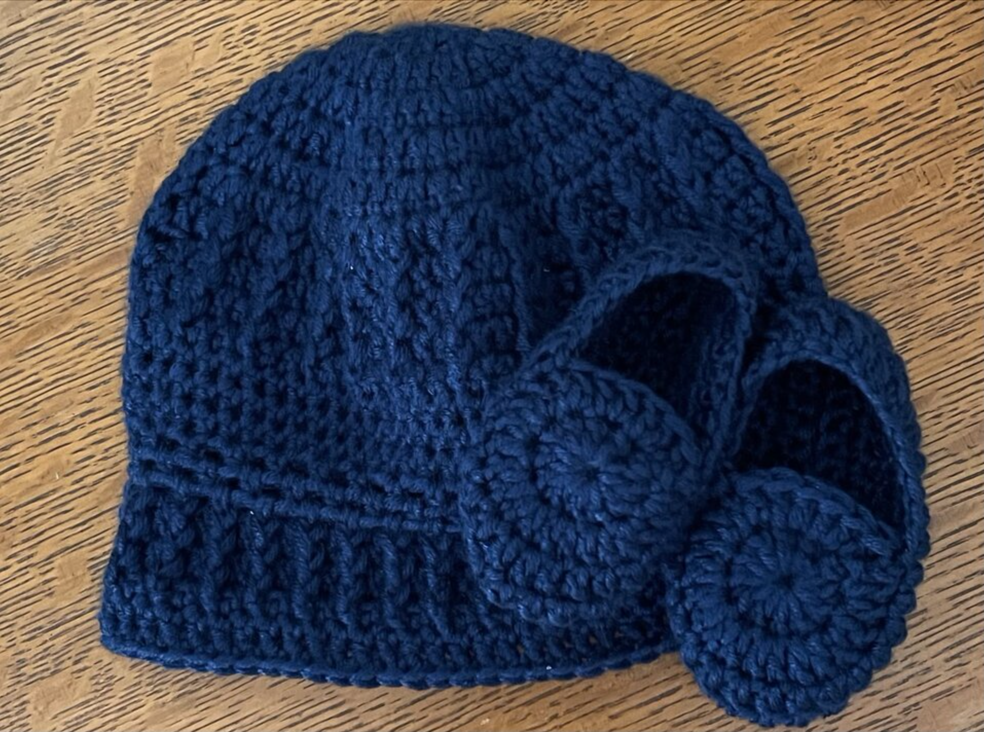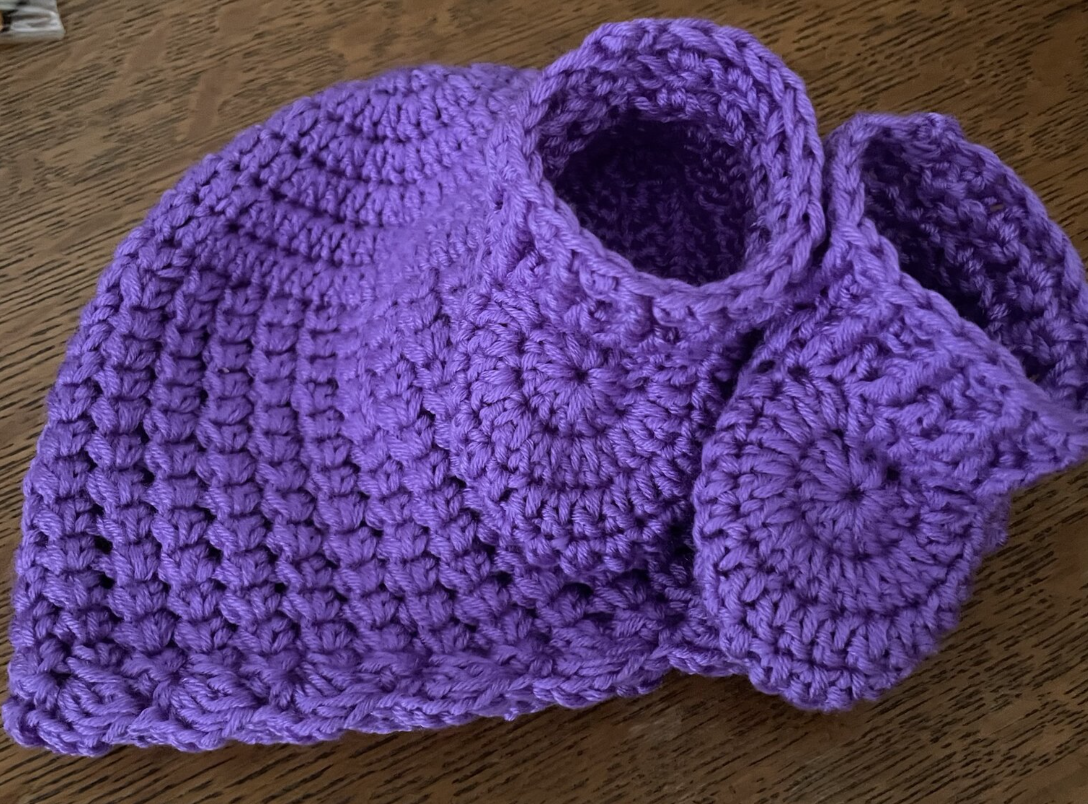 My daughter had her gender reveal party so I crocheted two sets, one for each gender. The Navy hat is my own design & the booties are from the Rainbow Connection pattern of Kristin’s. The Violet set is the Bryce Hat of Kristin’s and the booties are from the Rainbow Connection as well.