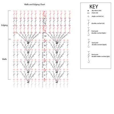 See glossary for chain (ch), double crochet (dc), single crochet (sc), front post double crochet (fpdc), back post double crochet (bpdc), front post treble crochet (fptr), 3 front post double crochet cluster (3fpdc-cl), front post double treble crochet 2 together (fpdtr2tog), and slip stitch (slst).