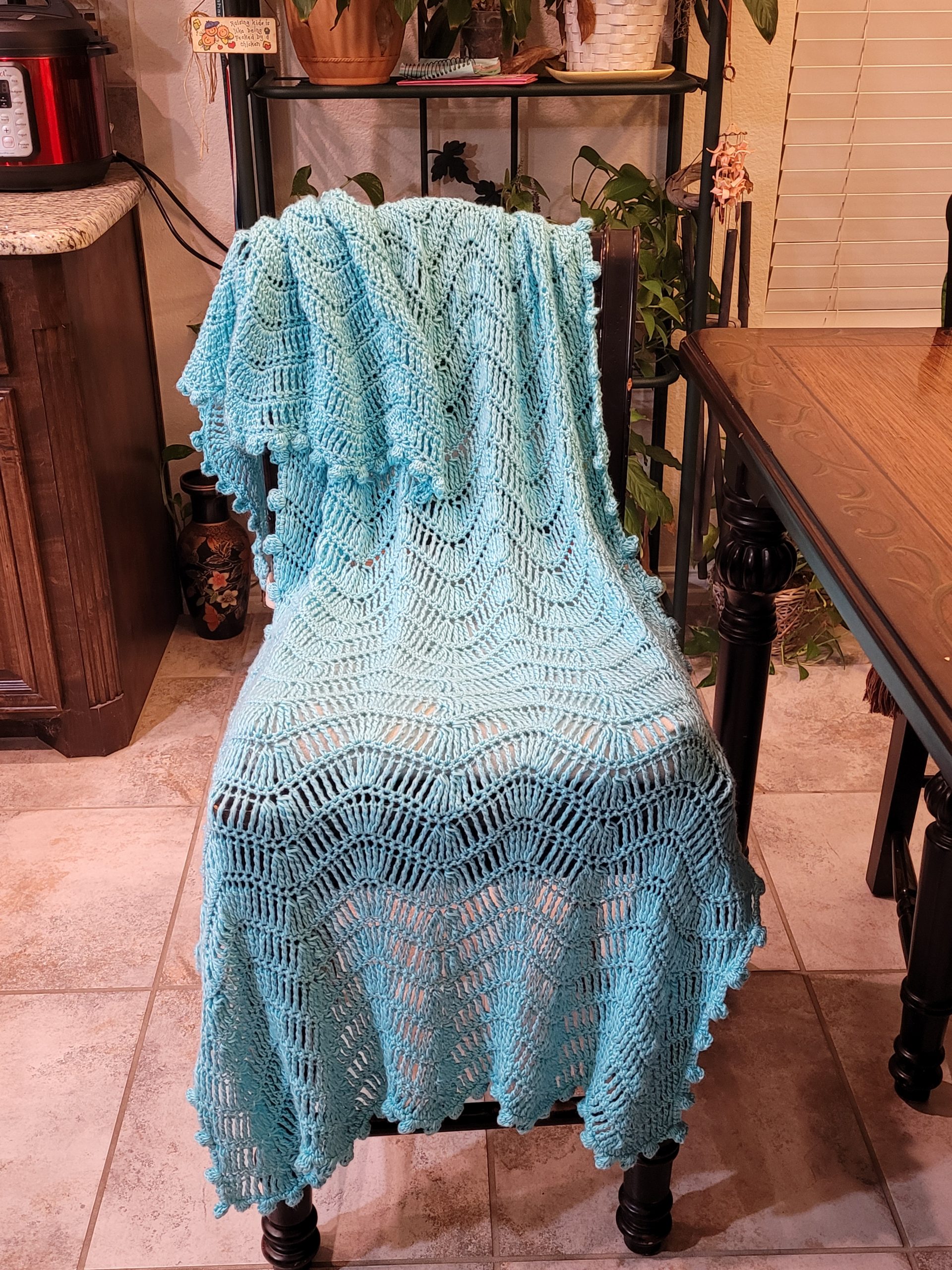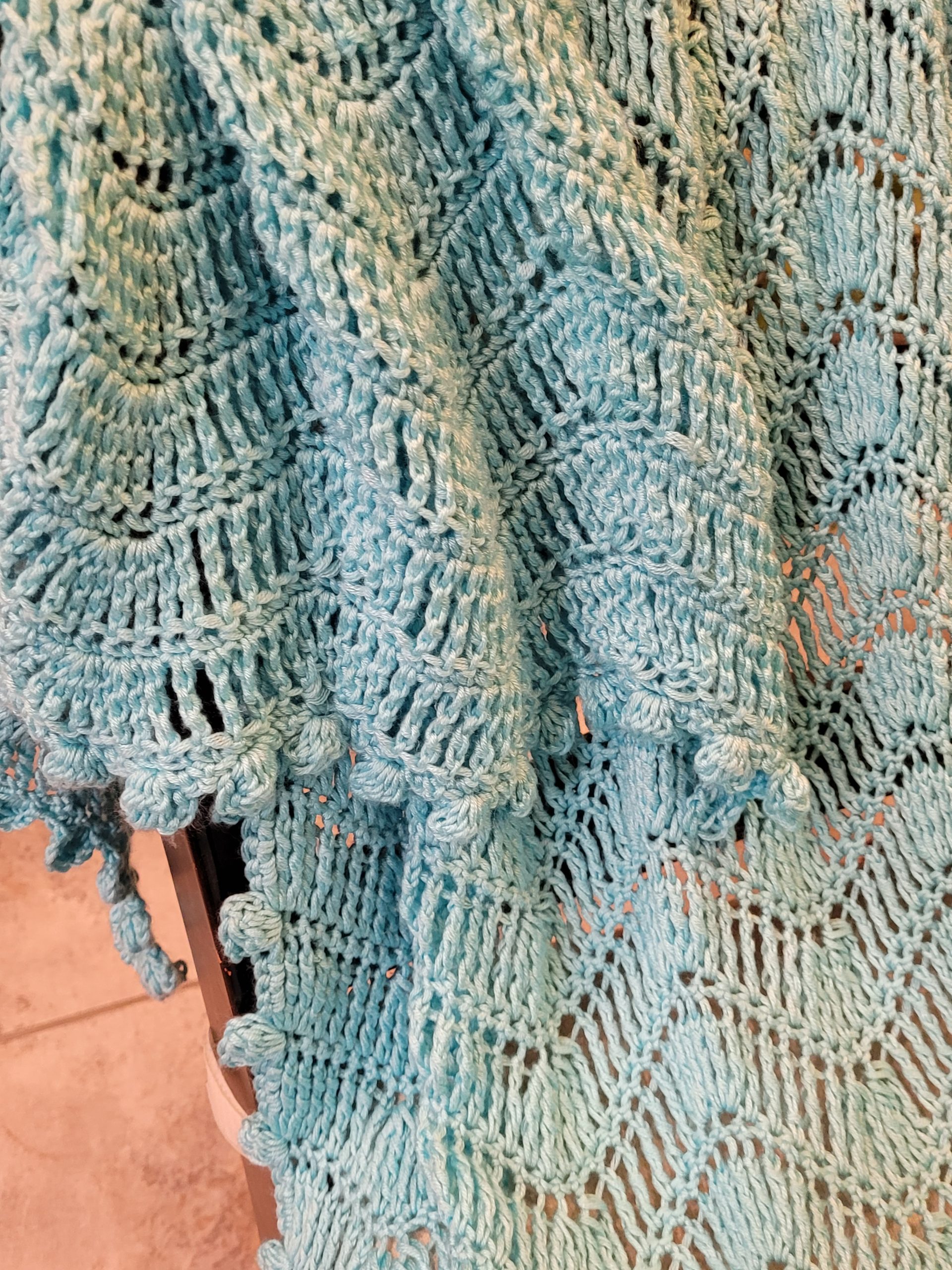 This is the third Mary Jane shawl and finally it’s mine! The other two were gifts. It is so soft and comfy! The first one was in color Dijon, second in Sugarplum, and this one Caribbean Turquoise.