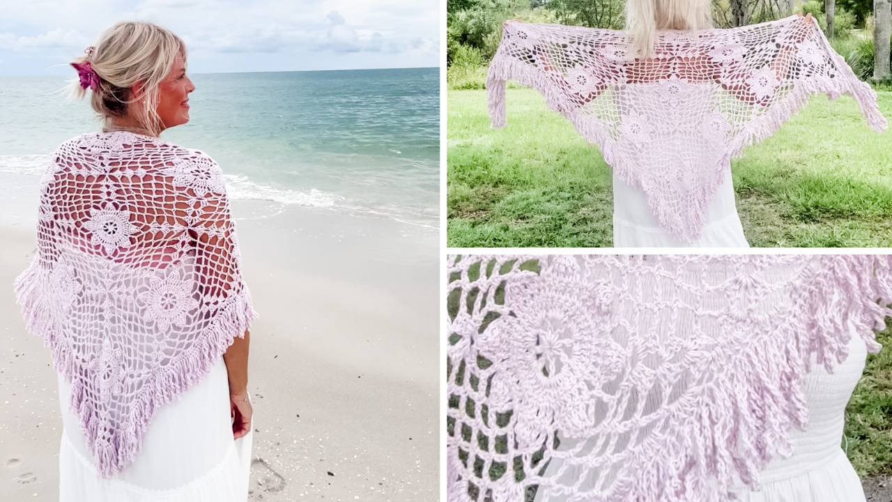 Like a gentle tide brushing the shore, the Tidal Whisper Shawl captures the rhythm and serenity of the sea through its delicate lace motifs and airy drape. Built from soft cotton squares and triangles that resemble rippling petals, each motif joins seamlessly to form a flowing triangular silhouette.